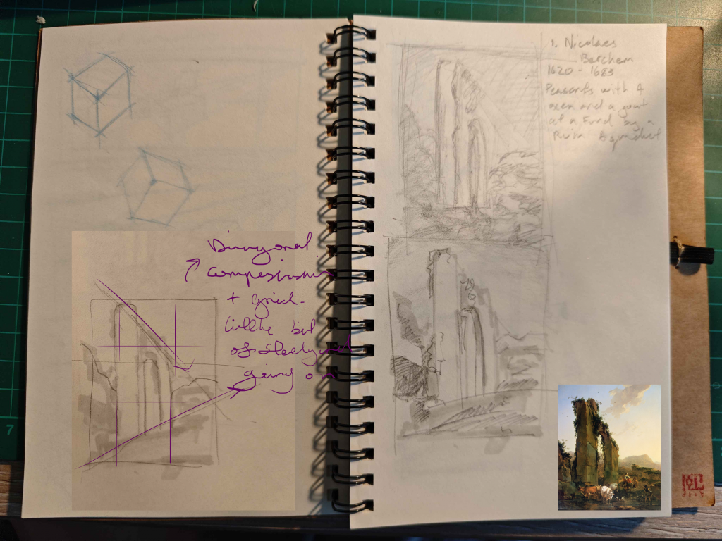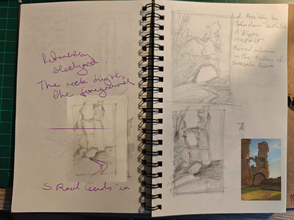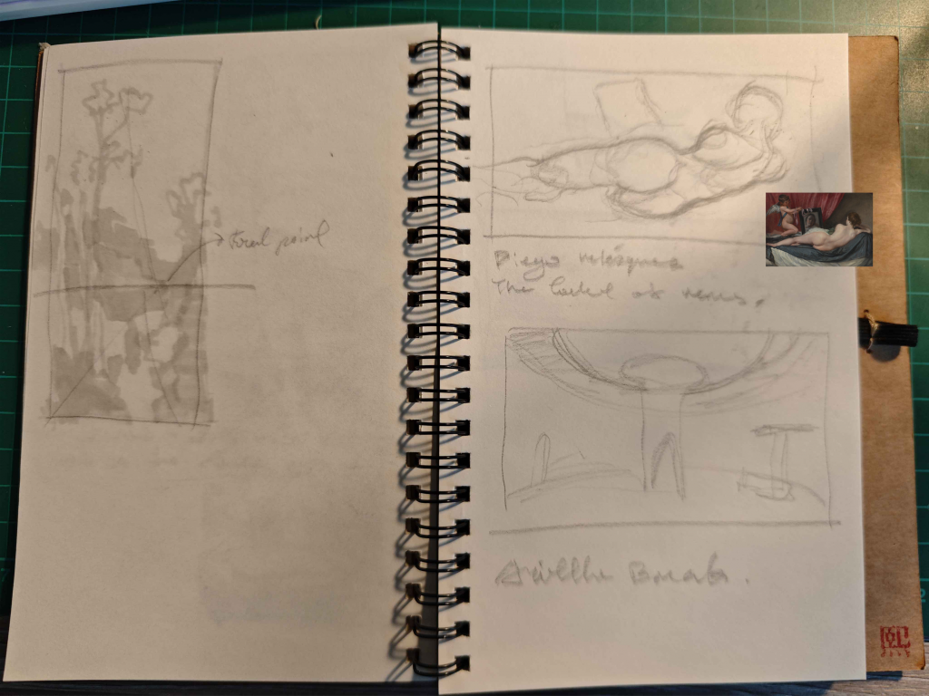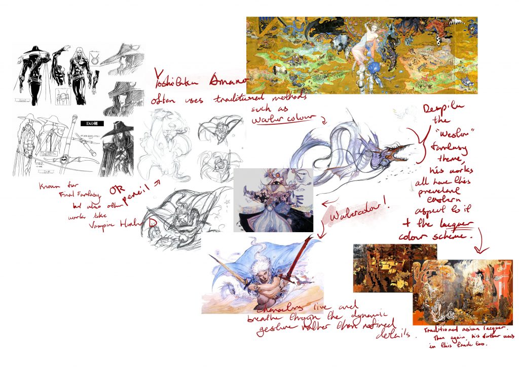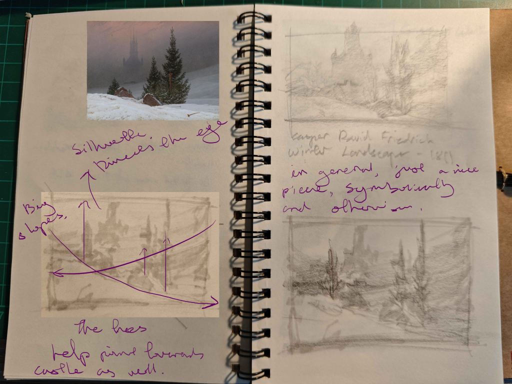 – Approach: Sketch or render the works in your own style, focusing on the aspects of mark making, composition, tone, and narrative.